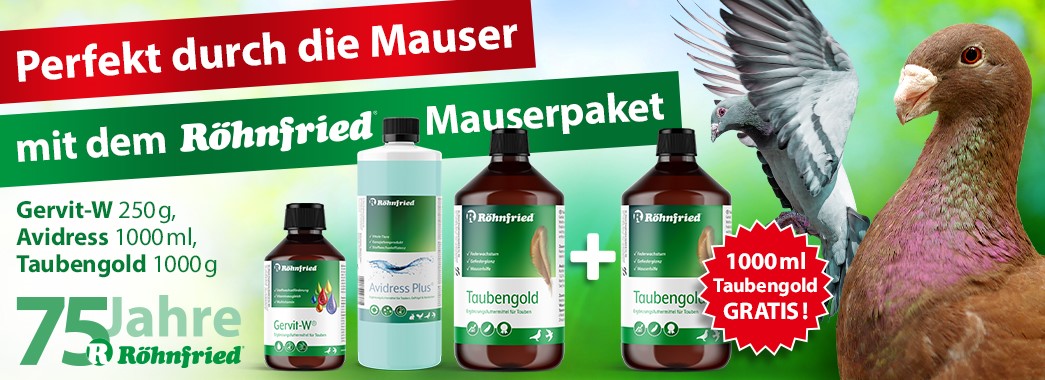 Damit auch im nächsten Jahr alles reibungslos funktioniert, ist es essentiell wichtig, dass die Tauben optimal durch die Mauser kommen! In unserem Shop finden Sie zahlreiche Produkte hierzu! Nutzen Sie zum Beispiel das Mauser-Paket der Taubenklinik für einen optimalen Federwechsel!